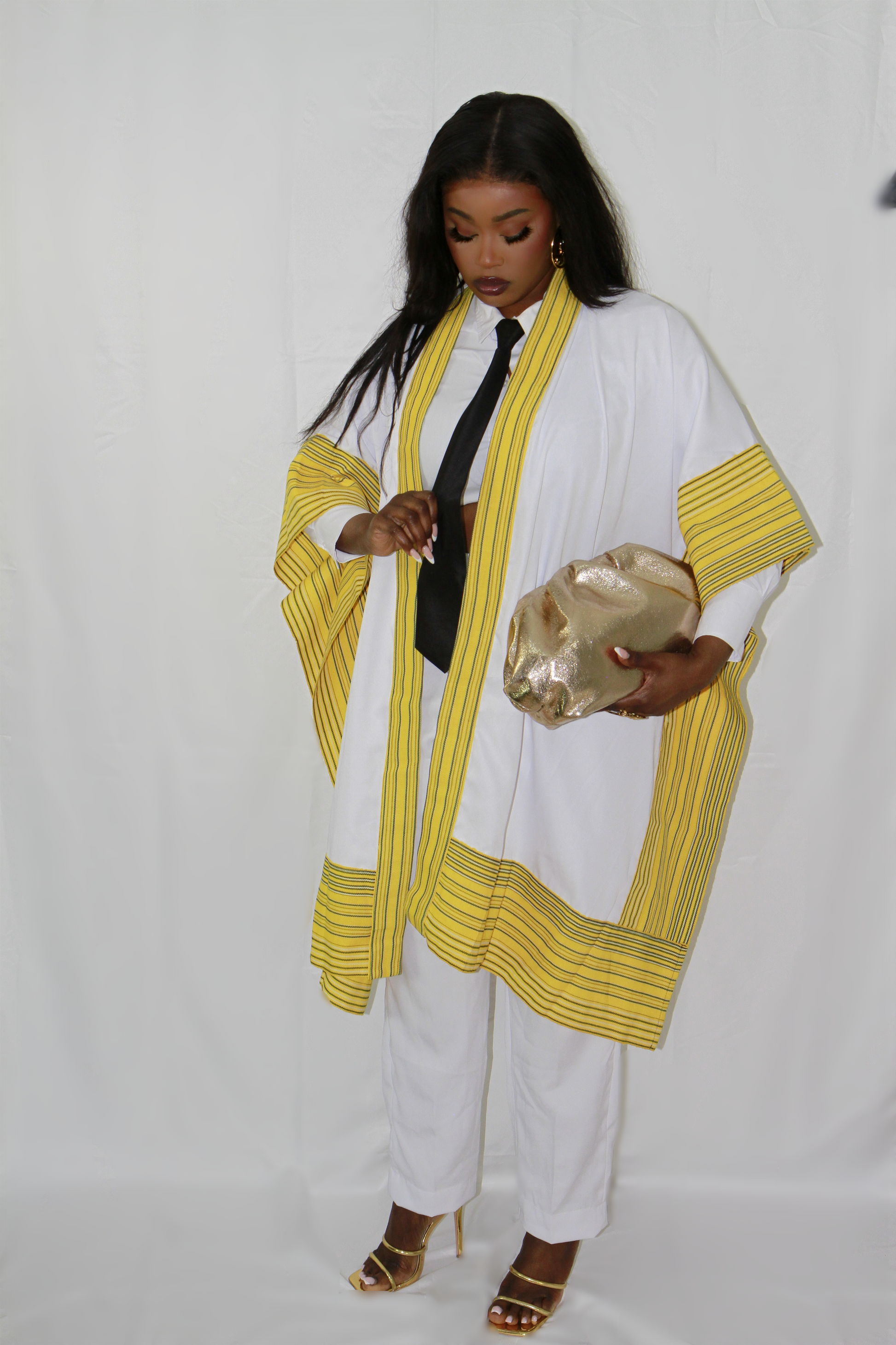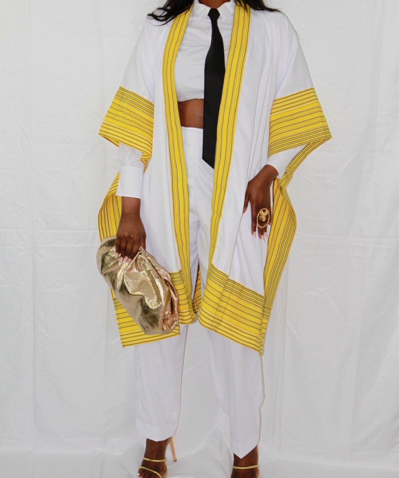 Affirmez votre élégance avec cet ensemble 2 pièces inspiré des traditions africaines. Composé d’un kimono long blanc orné de bandes tissées jaunes faites à la main et d’un pantalon taille haute assorti, ce look mêle finesse artisanale et modernité. Léger et fluide, il accompagne les femmes audacieuses qui osent l’originalité dans un style chic et affirmé.